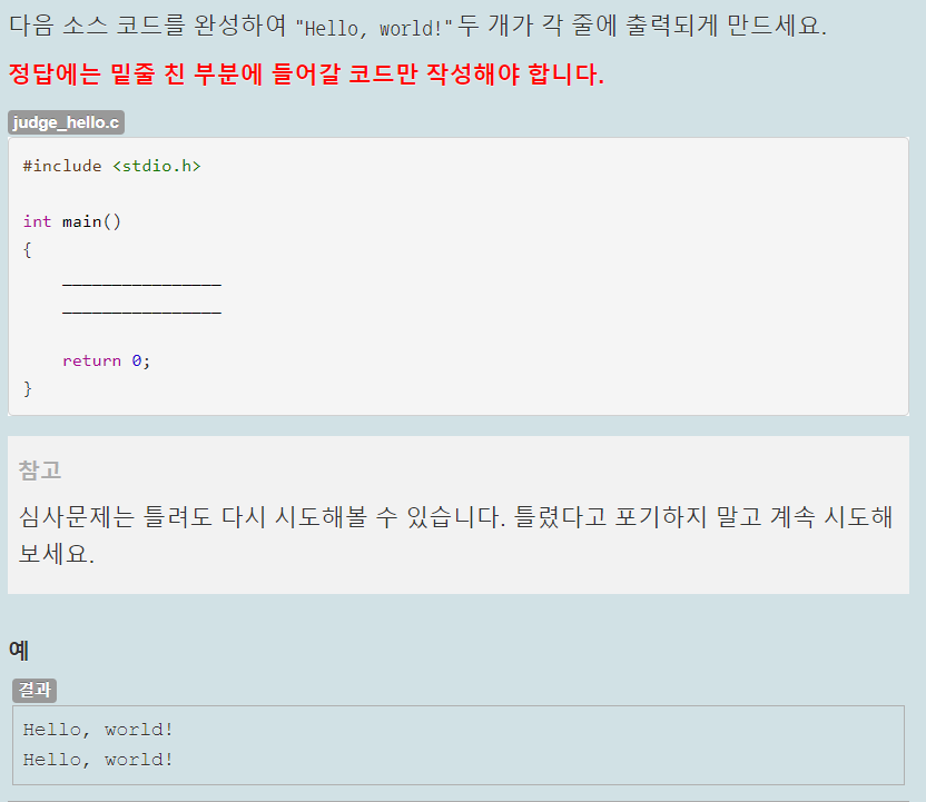 Hello, world! 두개가 각 줄에 출력되게 만드는 것이 목적이다. printf 함수를 이용하면 될 것 같다.