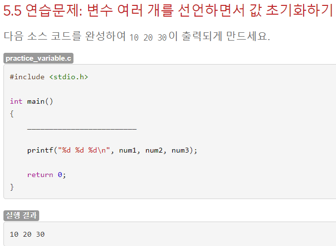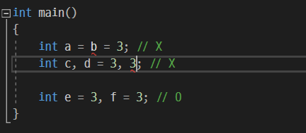 참고로 파이썬에서 같은 값을 할당해 줄때 사용했던 <변수1> = <변수2> = <값>을 c언어에서 써봤지만 안되는 것을 볼 수 있다. 또한 <변수1>, <변수2> = <값1>, <값2>도 안된다. c언어에서 같은 값을 할당해 주려면 <변수1> = <값1>, <변수2> = <값2> 이렇게 따로따로 해주는 방법밖에 없는 것 같다.