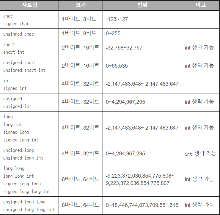 int, char long, short : 정수(각각 저장할 수 있는 크기가 다름)