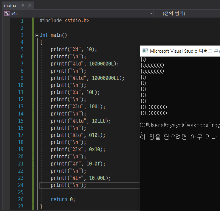 위 사진은 리터럴 접미사인데 별겨 없이 그냥 서식 지정자와 비슷하다. 각각에 해당하는 자료형은 사진에 정리되어 있으므로 따로 정리 없이 실습만 하도록 하겠다.