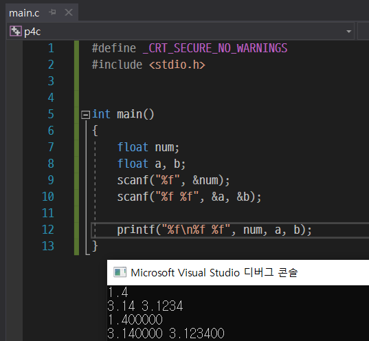 %d로 써준 부분만 %f로 바꾸니 실수가 입력된다. 마찬가지로 %f를 여러 번 써주면 여러 개의 실수 값도 입력이 가능하다.
