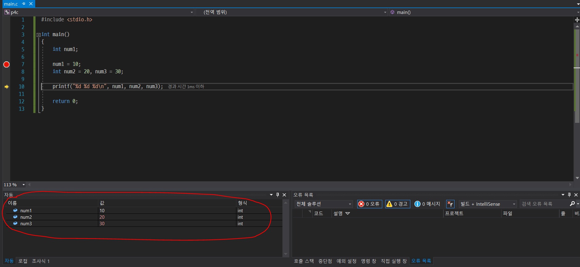 본론으로 돌아와서 int main()은 일반 함수가 아닌 특별한 기능을 하는 함수다. c언어로 콘솔 프로그램을 프로그래밍할 때는 이 main코드가 있어야 하는데(없다면 오류 뜬다.), 이 main의 기능은 프로그램을 컴파일하고 실행했을 때, 맨 처음 실행되는 함수다. 즉 파이썬의 경우 그냥 1행부터 순서대로 코드를 짜면 코드가 순차적으로 실행이 됐지만, 이 c언어는 1행부터 적을 수는 없고, 이 int main 함수 안에다가 코드를 적으면, 프로그램이 실행될 때, 이 main 함수 내의 코드들을 순차적으로 실행해 주는 것이다.