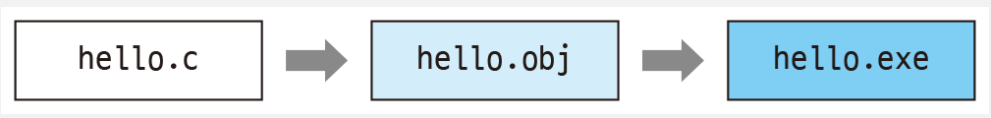 hello.c라는 코드를 작성했다 가정하면, 이 hello.c를 visual stdio에서 실행(빌드)하면 컴파일 과정을 거쳐 hello.c 파일이 hello.obj로 변환됐다가 실행파일인 hello.exe로 바뀌어서 실행되는 것이다.