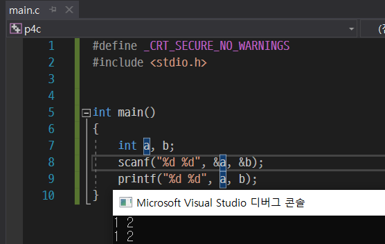 서식 지정자를 2개 써주고, 변수의 주소도 2개 써주니 두 개의 값을 한 번에 입력 받을 수 있다. 중요한 것은 scanf에서 입력 받을 변수 앞에는 꼭 &를 써줘야한다. scanf가 printf와 너무 비슷해서 &을 까먹고 안넣어주는 경우도 있는데, 이럴 경우 컴파일 에러가 뜨니 주의해야한다.