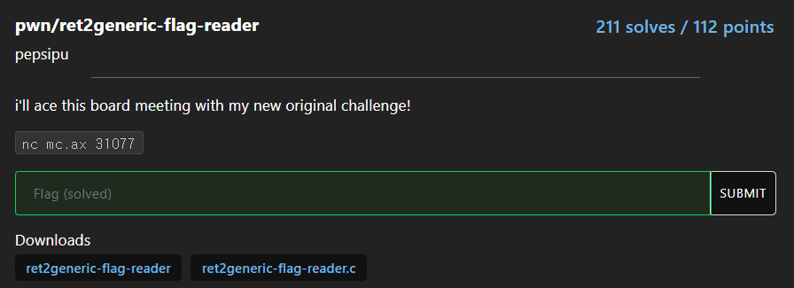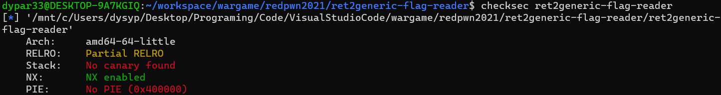 redpwnCTF의 ret2generic-flag-reader 문제다. 바이너리와 소스코드가 주어져 있다.
