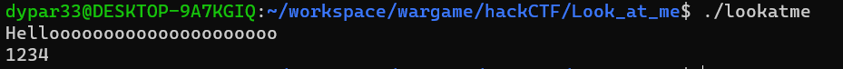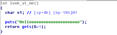 look_at_me 함수에서는 puts 함수를 통해 "Helloooo..."를 출력한 뒤 gets 함수를 이용해 입력 값을 v1에 저장한다.