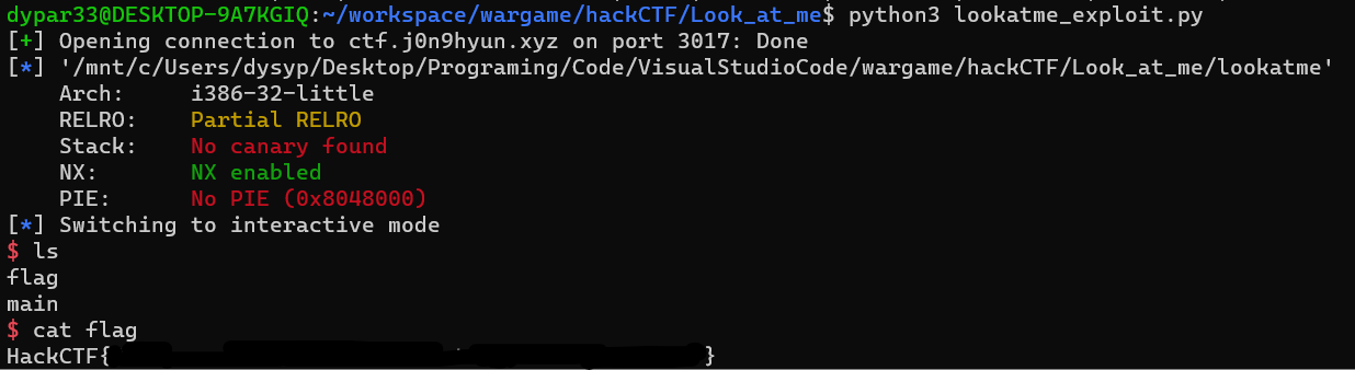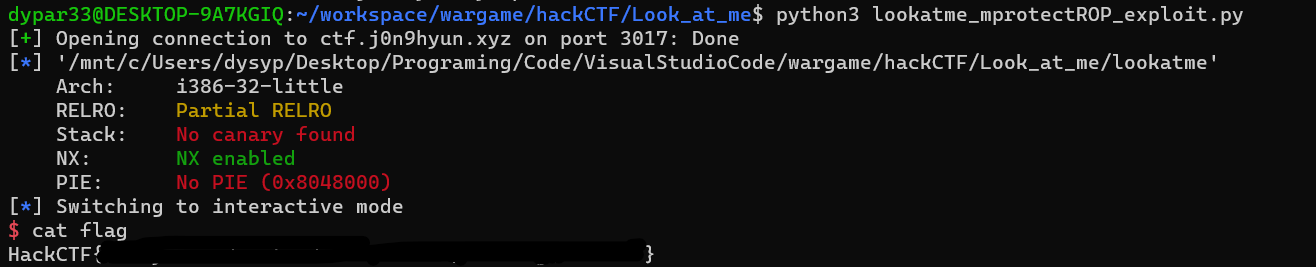HackCTF의 Look at me 문제다. 문제를 푼 뒤 다른 사람의 write up들을 확인했을 때, 내 풀이와 차이가 많이 나서 당황했다. (나는 sysrop로 풀었지만 다른 사람들은 mprotect 함수를 이용해 쉘 코드가 존재하는 주소에 실행 권한을 준 뒤, 해당 주소로 ret를 변조해 풀었다.)