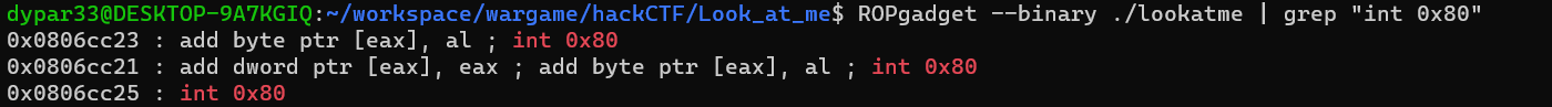 역시 int 0x80이 존재했다. 이 int 0x80은 eax 레지스터에 저장된 값에 따라 원하는 시스템 콜 명령을 호출할 수 있다. 32bit 기준 execve의 시스템 콜 번호가 0xb이므로 eax에 0xb를 넣고 ebx는 "/bin/sh" 문자열이 저장된 주소, ecx, edx에 0x0을 넣은 후 int 0x80을 실행한다면 쉘을 얻을 수 있을 것이다.