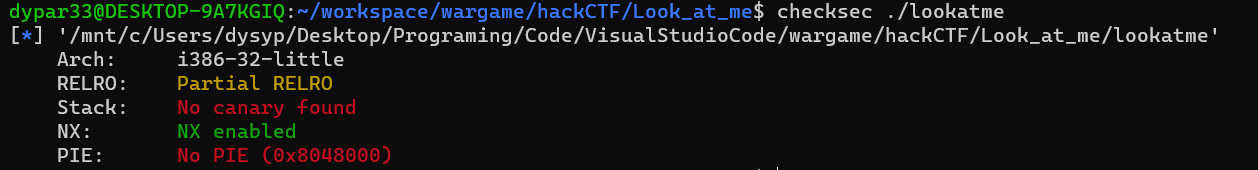 보호기법은 nx bit만 걸려 있는 것을 알 수 있다. 또한 32bit 바이너리인 것을 알 수 있다.