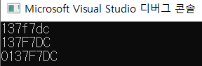메모리 주소가 16진수 형태라 혹시하고 16진수 서식 지정자인 %x, %X를 써서 출력해봤다. 위 결과처럼 잘 출력되지만 개인적인 생각으로는 %p의 결과가 좀 더 보기 좋은 것 같다.