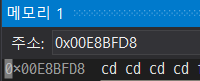 디버깅 모드에서 7행까지 실행해본 모습이다. 보면 b = &a 코드로 a의 메모리 주소를 포인터 변수 b에 넣어줬고 역참조인 *b는 a의 값인 1을 가리키는 것을 볼 수 있다. 포인터 변수 b가 a의 주소를 갖는 것을 확인했고, 역참조를 사용했을 때 a 주소의 값인 1을 갖는 것을 봤으니 이제 메모리 뷰에서 a의 위치를 확인해볼 것이다.