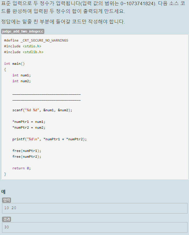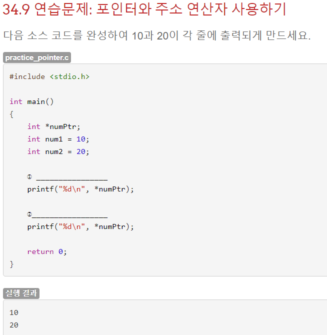 빈 칸을 채워서 10, 20이 각 줄에 출력되게하는 것이 목적이다. num1, num2에 각각 10, 20이 저장돼 있고 출력문은 포인터 변수 numPtr의 역참조 값을 출력하므로 numPtr에 num1, num2의 메모리 주소를 각각 받으면 될 것 같다.