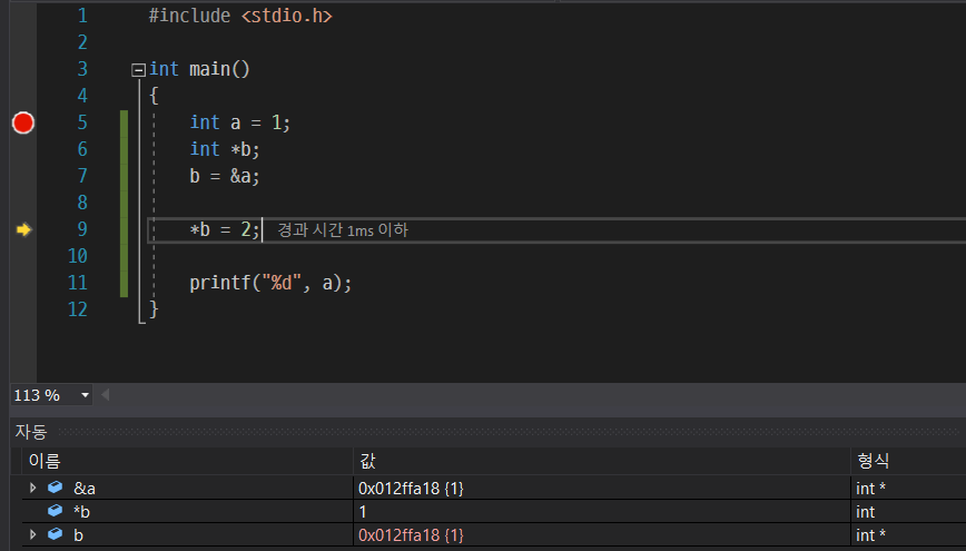 위는 1이 들어간 a의 주소를 포인터 b에 넣고 역참조 연산자를 사용해 *b를 2로 바꿔주는 기능을하는 코드다. 위 코드를 디버깅 할 것이다.(앞에서 디버깅 방법은 다뤘으므로 디버깅 방법은 생략하겠다.)