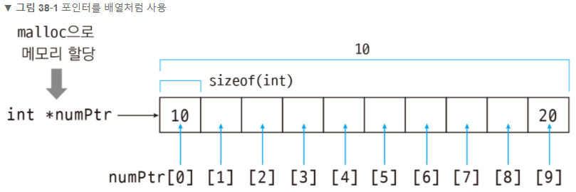 포인터를 1차원 배열처럼 사용하는 방법은 <자료형> *<포인터 명> = malloc(<자료형 크기>*<배열 크기(요소 개수)>);로 하면 된다.