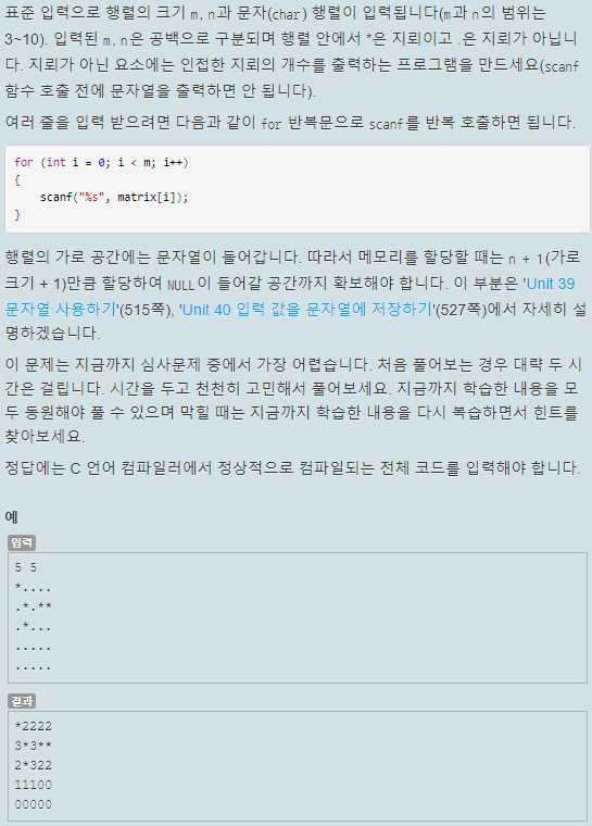 파이썬 코딩도장에서 가장 오랫동안 붙잡고 있었던 문제가 c언어 코딩도장에서도 나왔다. 지뢰찾기 규칙에 맞게 입력된 행렬에 지뢰와 주변의 지뢰의 개수를 표시하는 것이 목적이다.