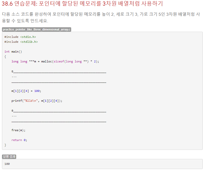 높이 2, 세로 크기 3, 가로 크기 5인 3차원 배열을 포인터로 만들고 [1][2][4]에 100을 저장하고 출력하는 것이 목적이다. 3차원 배열이니 삼중 포인터를 베이스로 높이 -> 세로 -> 가로 메모리를 확보하고 [1][2][4]에 100을 저장하면 될 것 같다.