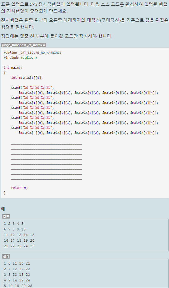 5*5 크기의 배열에 입력 값들이 저장되는데, 이 배열의 전차 행렬(왼쪽 위에서 오른쪽 아래까지의 대각선을 기준으로 뒤집은 것)을 출력하는 것이 목적이다.