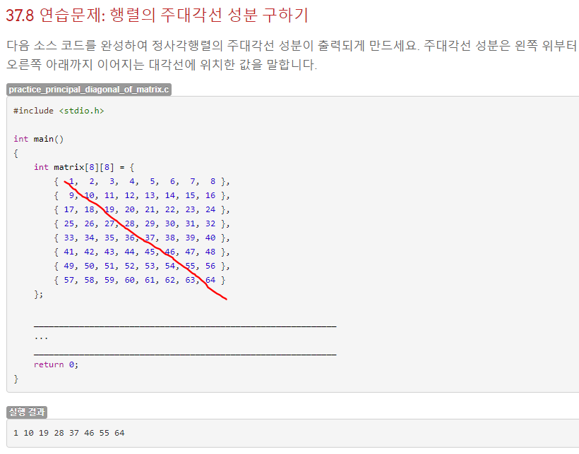 대각선으로 출력한다는 것은 매번 인덱스가 가로 세로 모두 1씩 증가해야 한다는 뜻이니, 0부터 배열의 세로 크기까지 반복하는 for문 작성(가로, 세로의 크기가 똑같기 때문에 그냥 세로 크기를 구했다.) 한 후 1씩 증가하는 [i][i] 인덱스의 값이 출력되도록 작성했다.