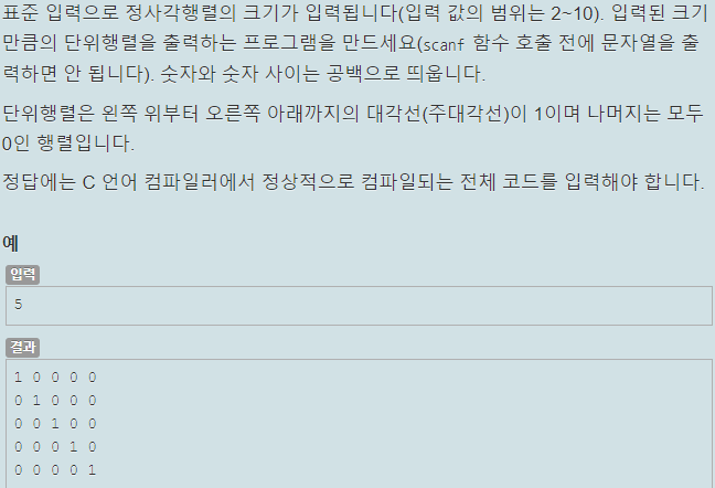 정사각행렬의 크기가 입력되면 왼쪽 위부터 오른쪽 아래까지 대각선으로 1로 채우고 나머지는 0으로 채운 상태로 출력하는 것이 목적이다.