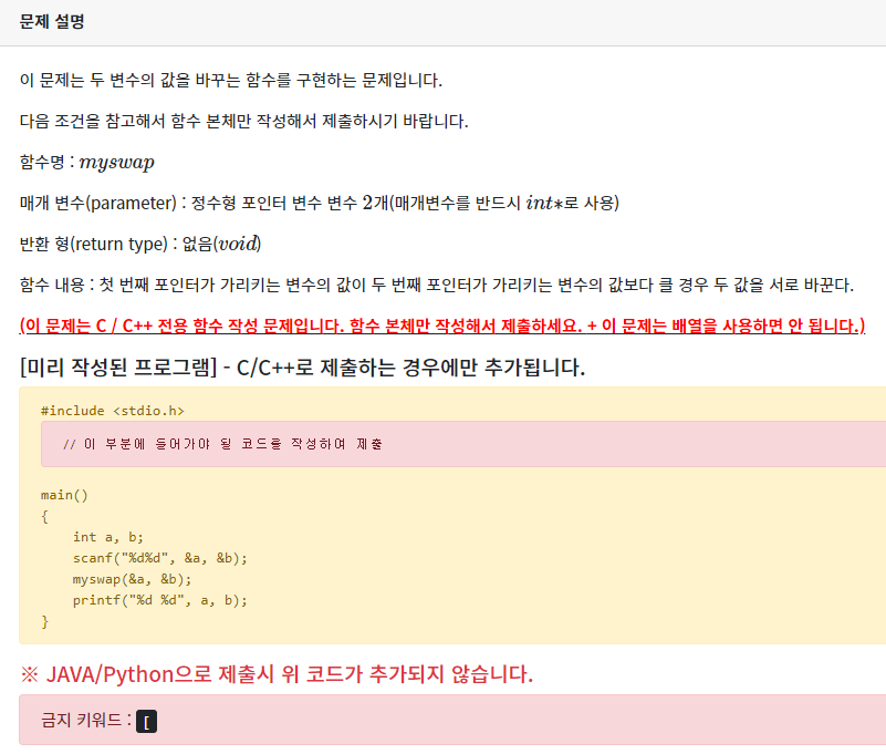 위는 문제의 코드 + 작성한 myswap 함수를 합친 것이다.(제출은 myswap 함수만 해야한다.)