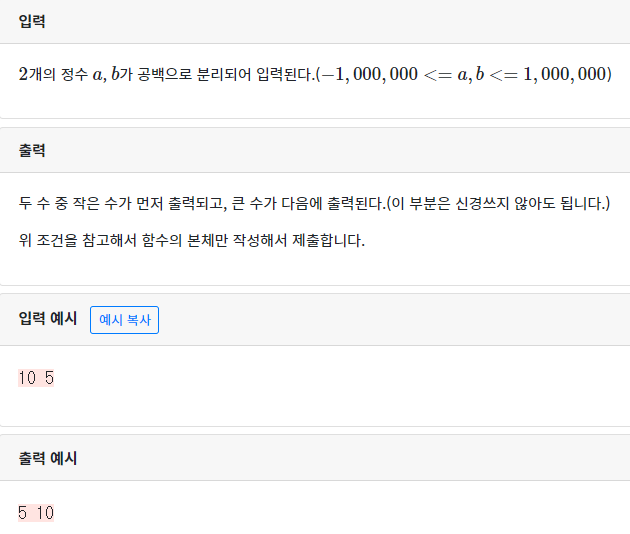 두 수를 a, b 변수에 입력 받은 후 void형 myswap 함수를 작성해 a의 값이 b 값보다 크다면 두 변수의 값이 서로 바뀌도록 하는 것이 목적이다. myswap 함수를 작성해야하는데, 주어진 코드를 보면 myswap의 인자로 변수의 값이 아닌 변수의 주소가 주어진다. 이 주소를 포인터로 입력 받아 역참조해 값을 서로 바꿔주면 될 것 같다.