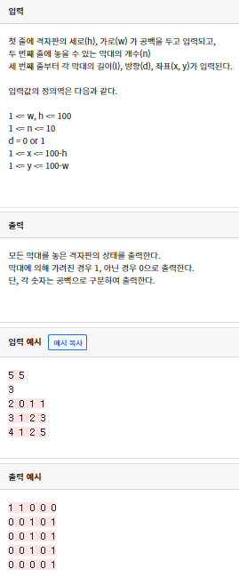 입력된 격자판의 세로, 가로, 막대의 개수, 막대의 길이, 방향, 좌표(x,y)를 바탕으로 격자판에 막대들을 둔 상태로 격자판을 출력하는 것이 목적이다.