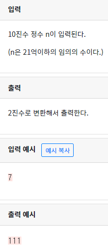 10진수를 2진수로 변환해서 출력하는 것이 목적이다. 배열을 활용한 풀이도 가능하지만 포인터와 동적할당을 이용해서 풀이하겠다.
