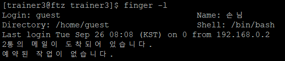 finger -l 명령어를 사용하면 더 자세하게 사용자들의 정보를 볼 수 있다.