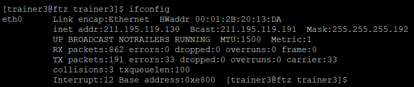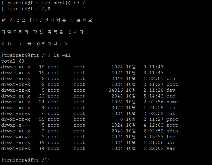 위는 리눅스를 사용하거나 telnet으로 리눅스 서버로 접속을하면 볼 수 있는 프롬프트다. 프롬프트의 맨 앞 trainer1 부분은 접속 ID, 두 번째 부인 ftz는 서버, 마지막 trainer1은 현재 위치를 뜻한다.
