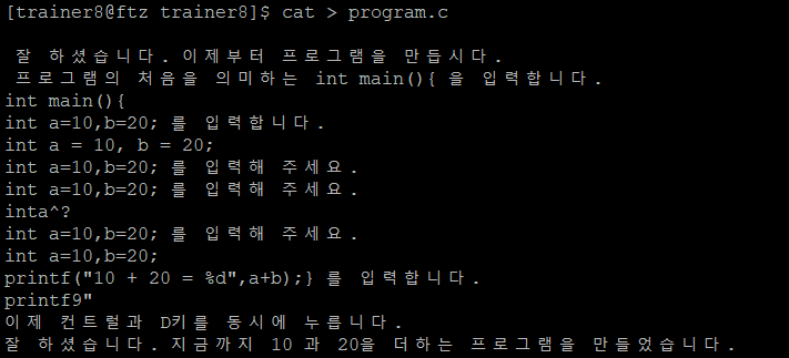 trainer8에서는 텍스트 파일 생성, 추가와 간단한 c언어 파일을 만들고 컴파일 과정을 거쳐 직접 실행해 본다.