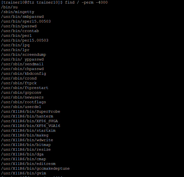 find / -perm 4000을 입력하면 setuid가 걸린 모든 파일들을 찾을 수 있다. find는 파일을 찾는 명령어로 '/'는 최상위 디렉토리부터 찾는 다는 것을 뜻하고, -perm은 권한과 일치하는 파일을 찾아주는 옵션이다. 4000에서 4는 setuid를 의미하고 000은 각각 r, w, x를 모두를 의미해서 이대로 검색한다면 setuid가 걸린 모든 파일들을 찾아주는 것이다.