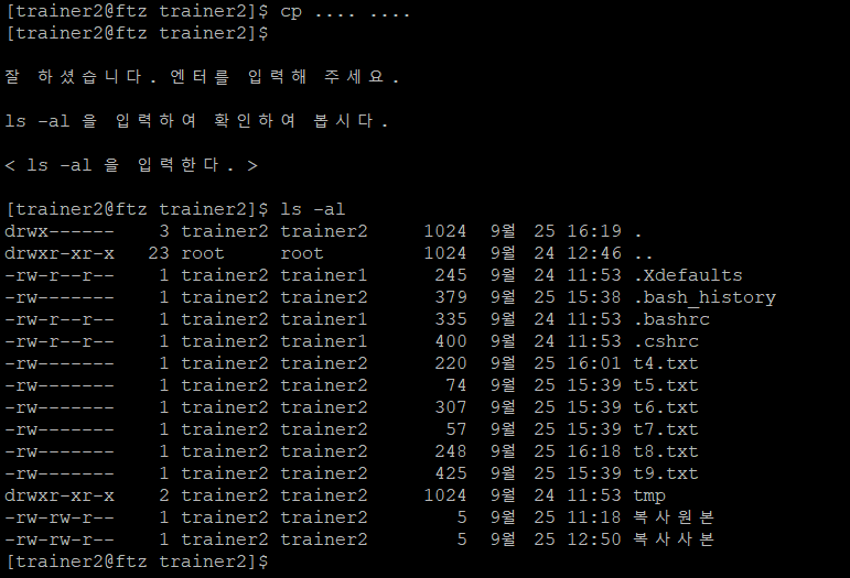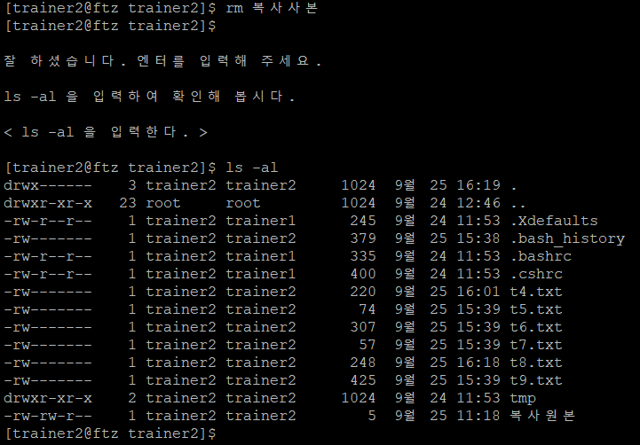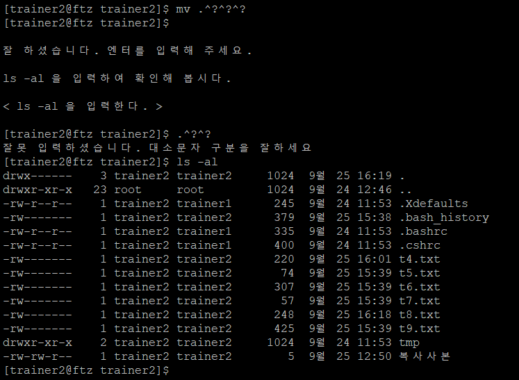 원래는 mv 복사원본 복사사본을 입력해야하지만 실수로 잘 못 입력했는데 pass가 되서 어쩔 수 없이 이대로 캡처를 했다. (제대로 입력했다고 가정한다.)ls -al로 확인해보면 복사원본 파일이 복사사본 이름만 바뀐 것을 볼 수 있다. 참고로 trainer2에는 나오지 않았지만 mv 파일명 경로를 입력한다면 그 위치로 파일이 이동되기도 한다.