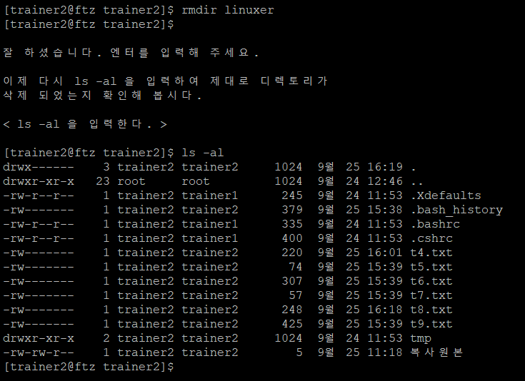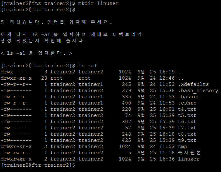 trainer2에서는 디렉토리와 디렉토리간의 이동, 새 디렉토리 생성, 삭제, 파일의 복사, 이동, 삭제 등에 대해 다룬다.