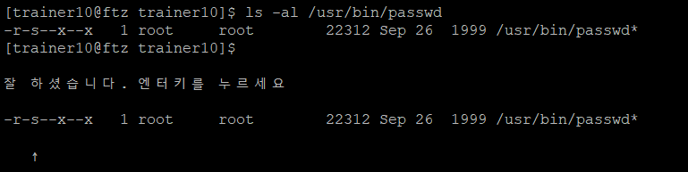 ls -al 명령어로 계정 정보가 들어있는 /usr/bin/passwd의 정보를 보면 다음과 같다. 보면 화살표가 가리키는 위치에 r, w, x가 아닌 s가 존재하는데, 이는 우리가 배우지 않았던 것이다. 이 s는 setuid를 나타낸다. 즉 해석해보면 저 파일을 여는 사용자는 setuid 덕분에 root 권한을 잠시동안 갖게 되는 것이다.