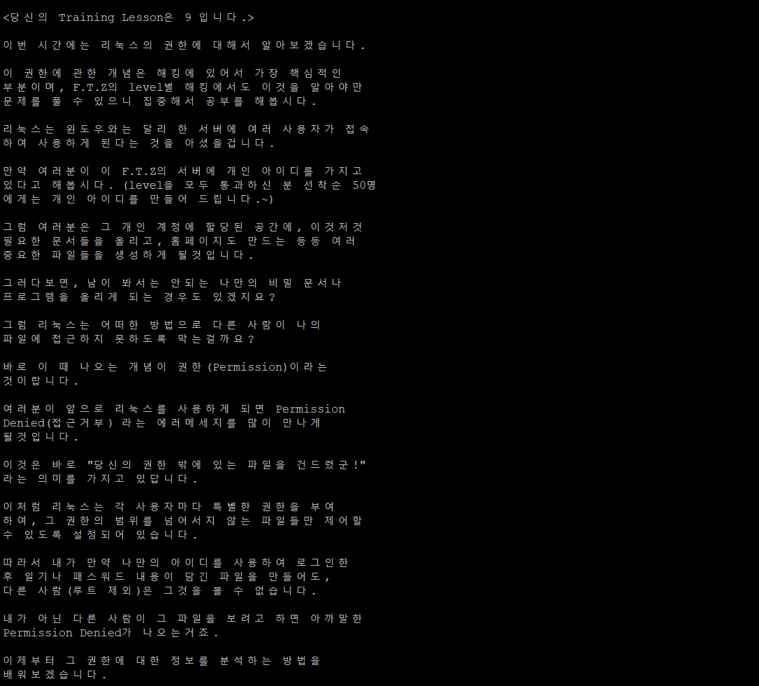 trainer9에서는 권한에 대해서 다룬다. 리눅스 서버에 들어가본 경험이 있다면 가끔가다 어떤 파일에 접근하려할 때 permission denied가 뜨는 경우가 있을 것이다. 이 오류가 바로 권한 밖에 있는 파일을 건들었을 때 나오는 에러 문구다.