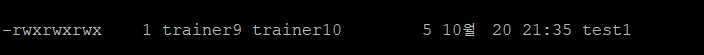 -rwxrwxrwx 1 trainer9 trainer10 5 10월20 21:35 test1