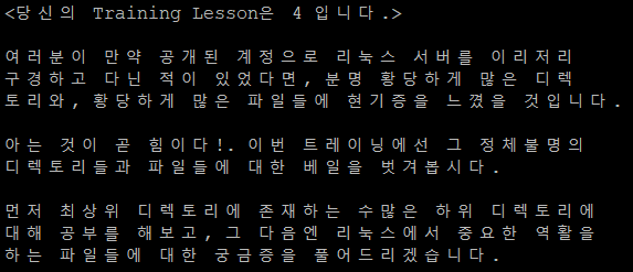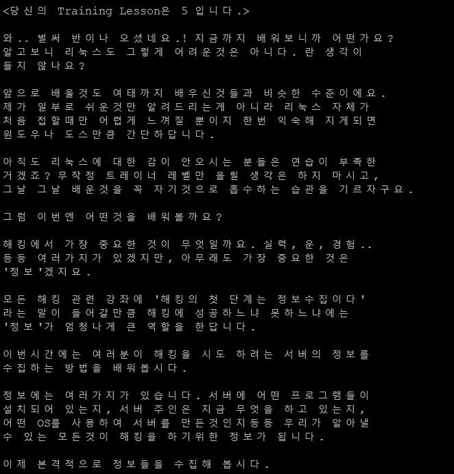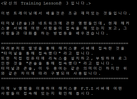 trainer2에서 받은 암호로 trainer3로 로그인하면 위와 같은 화면이 나온다. 이번에는 터미널과 네트워크에 관한 명령들을 다룬다고 한다.