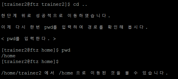 cd ..을 입력하니 프롬프트의 끝 부분이 trainer2에서 home으로 변한 것을 볼 수 있다. pwd 명령어로 현재 경로를 확인해 보면 /home/trainer2에서 /home으로 변한 것을 볼 수 있다. 즉 /home/trainer2 디렉토리에서 /home 디렉토리로 이동한 것이다.