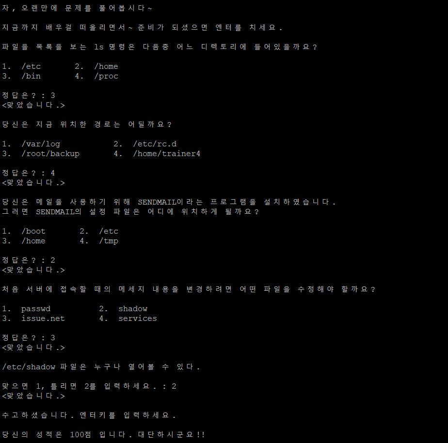 trainer1에서 받은 암호를 바탕으로 trainer2로 로그인하면 위와 같은 문장들이 출력된다.