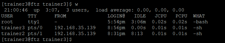 위는 w를 입력했을 때 나오는 사용자 명단이다. 원래는 root(로컬)와 trainer3만 나오겠지만 나는 writeup을 위해 추가로 trainer2 계정으로 접속해 있는 상태라 trainer2가 나온 것 같다.
