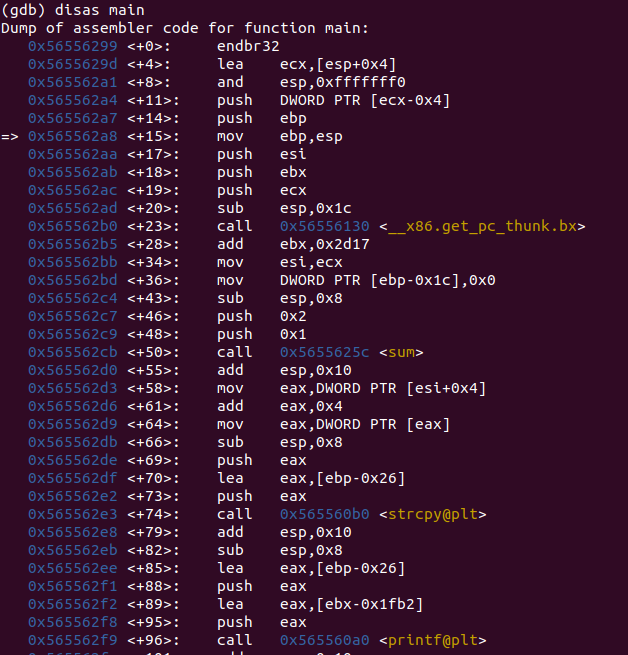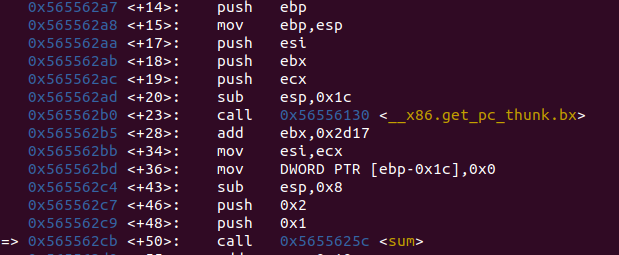 ret를 만나면 스택에 있던 복귀주소인 0x565562b5로 리턴하고 끝으로 sum의 스택 프레임이 완전히 정리된다.