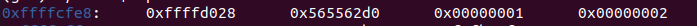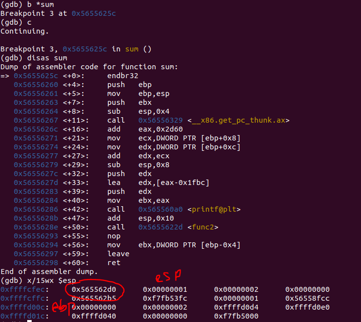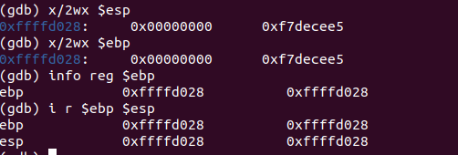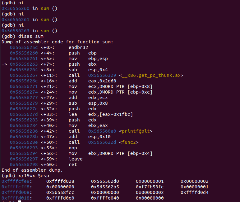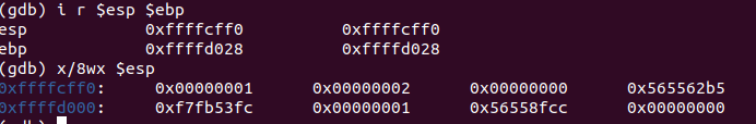 i r로 esp, ebp의 값을 확인하고 x/8wx로 esp 주소의 32 바이트 만큼 값들을 확인해보면 먼저 매개 변수인 1, 2가 0xffffcff0, 0xffffcff4에 존재하는 것을 볼 수 있고, ebp, esp가 각 끝에 존재하는 것을 볼 수 있다.
