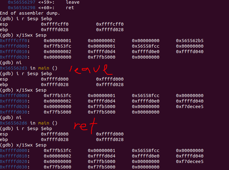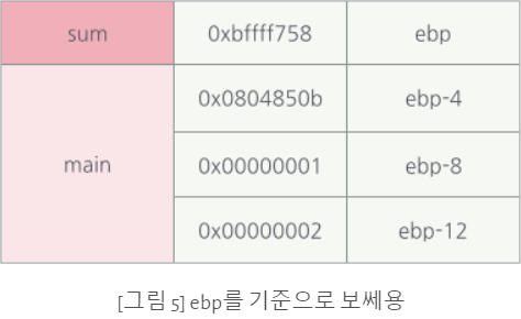 위는 sum 함수의 leave, ret를 실행했을 때의 각 스택 상태다.