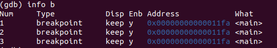 위에서 b 명령어로 같은 위치에 3개의 bp를 걸었으니 당연히 3개의 bp가 출력된다.