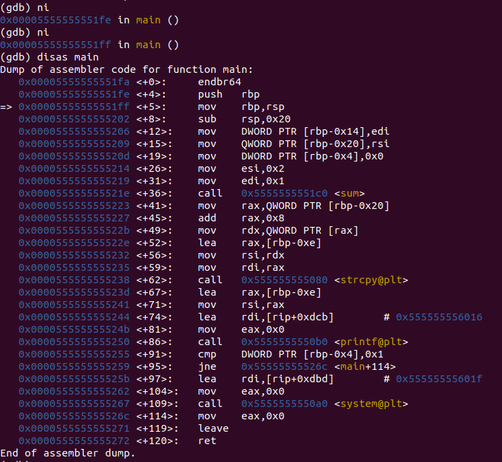 ni로 여러 번 다음 명령을 실행한 후 disas main으로 main의 어셈블리를 확인해보면 화살표의 위치가 2칸 아래로 바뀐 것을 볼 수 있다.