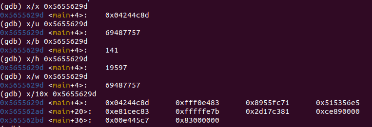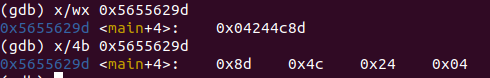 그리고 위처럼 x/wx, x/4b를 비교해보면 다르게 출력되는 것을 볼 수 있다. 둘다 같은 주소에서 4바이트만큼 읽어오는 것인데 x/wx는 0x04244c8d가 출력된지만 x/4b는 0x8d 0x4c 0x24 0x04 이렇게 값이 거꾸로 출력되는 것을 볼 수 있다.