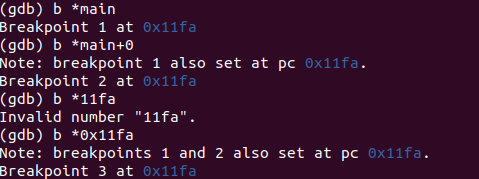 위는 disas main에서 본 정보를 바탕으로 main 함수의 시작점에 각기 다른 방법으로 bp를 걸어본 모습이다. 첫 번째는 함수명으로 bp를 걸었고, 두 번째는 상대 주소로 main 함수의 시작 부분에서 0만큼 떨어진 부분(결국 main 함수 시작 부분)에 bp를 걸었다. 세 번째는 0x11fa 주소에 bp를 걸려했지만 실수로 0x를 안써줘서 오류가 떳었다. b *0x11fa를 써주니 정상적으로 0x11fa 주소에(main의 시작 부분) bp가 걸렸다.