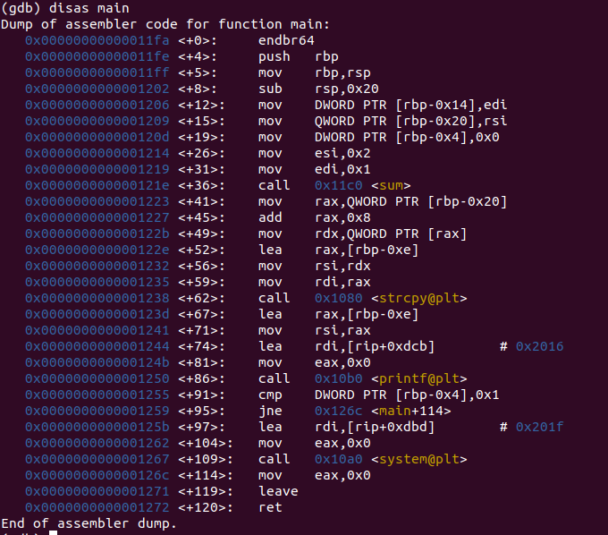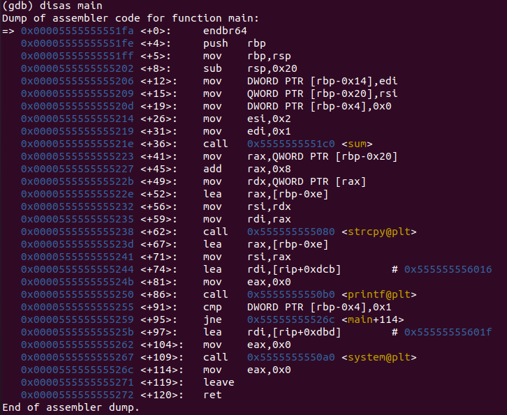 disas [함수명] 명령어는 원하는 함수의 어셈블리 코드를 보게 해주는 명령어다.