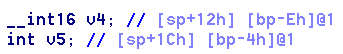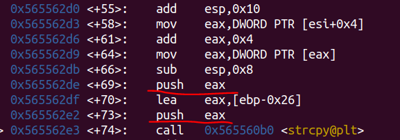 어쨌든 push를 통해 eax에 전달받은 인자(v4, v5)를 스택에 넣어주는 코드고, 그 전을 보면 +70에 lea eax, [ebp-0x26] 이라는 코드가 있다. 이 코드를 봤을 때 v4 변수의 주소는 ebp-26이라는 것을 알 수 있고, 이 주소를 eax에 전달한 후 push로 ebp-26 주소를 스택에 넣어주는 것을 알 수 있다.