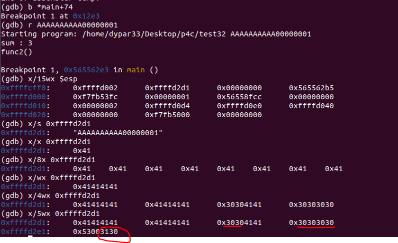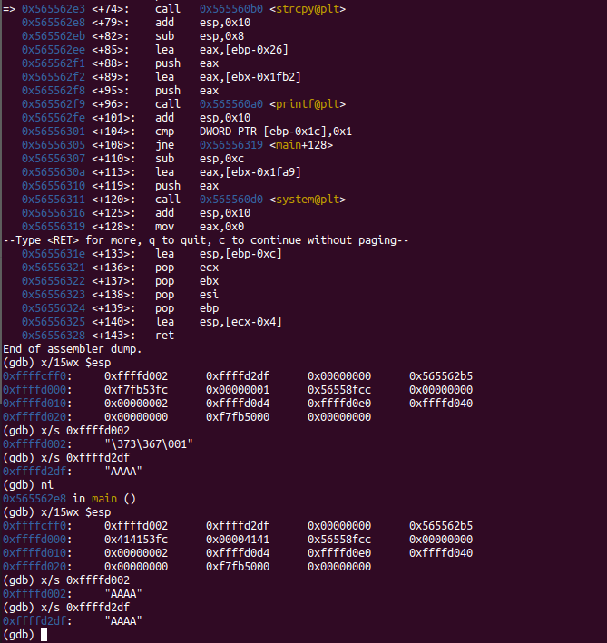 gdb에서 동적으로 확인해 보면 strcpy 전 스택에서 0xffffcff0이 v4, 0xffff4가 argv[1]이고, strcpy 호출 후 argv[1]의 값이 v4로 잘 복사되는 것을 볼 수 있다.